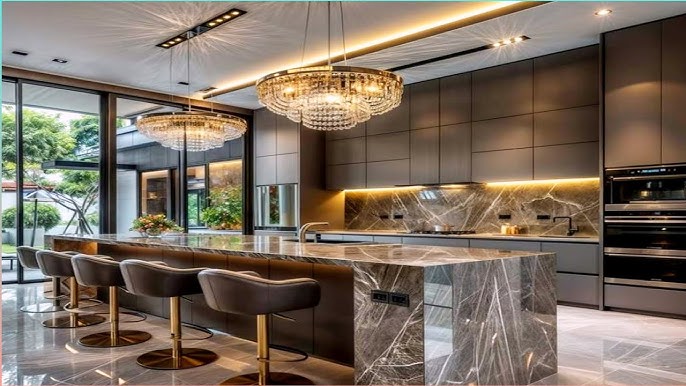 Modern kitchen design relies on material creation because it needs designers to combine matte cabinets with high-quality countertops and use wood elements together with painted surfaces and design stone materials with rough cabinet doors.